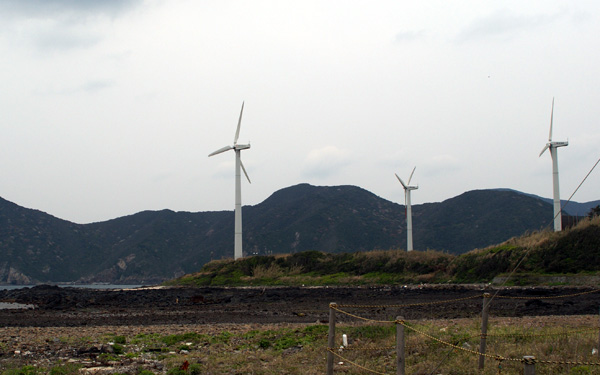 遠くで稼動する風車を指差して